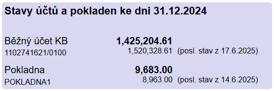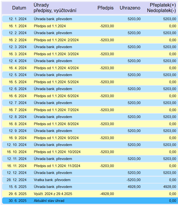 Na modrém řádku dole je zobrazen aktuální předplatek nebo nedoplatek ke dni uzávěrky úhrad. Tento obrázek jsme pořídili na začátku července 2025, proto je stav úhrad platný k 30.6.2025.