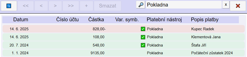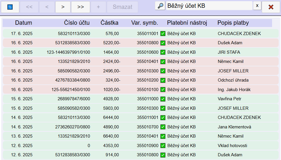 Velmi jednoduše lze zobrazit všechny bankovní pohyby podobně jako v internetovém bankovnictví. Zelené zatržítko ✅ indikuje, že pohyb je spárován na základě variabilního symbolu s konkrétním vlastníkem.