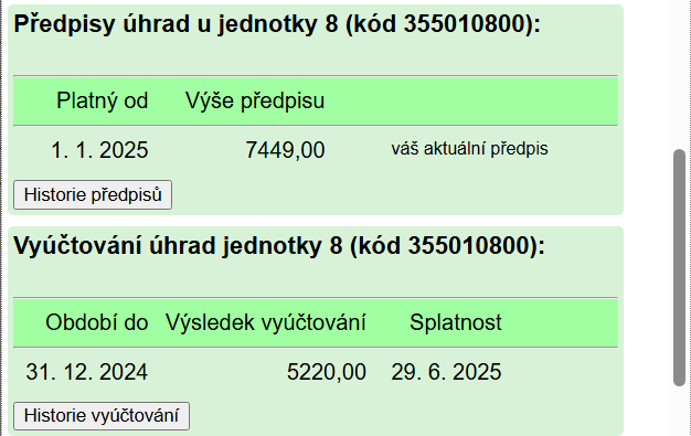 Po kliknutí na libovolného vlastníka v této tabulce se zobrazí historie předpisů a úhrad vybraného vlastníka. Podobnou tabulku s historií si může zobrazit i sám vlastník bytu, ale pouze pro svůj byt.