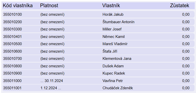 Zde správce vidí pro jednotlivé vlastníky jejich přeplatky a nedoplatky. V tomto případě ideální stav - nikdo nic nedluží. Za povšimnutí stojí i poslední dva řádky, na kterých vidíme stav konta dvou různých vlastníků téže jednotky. Jednotka č. 10 totiž byla prodána a při předání bytu bylo dohodnuto, že původní vlastník (pan Vavřina) platí měsíční úhrady do konce listopadu 2024, zatímco od prosince 2024 již hradí nový vlastník (pan Chudáček).
