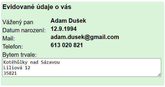 Základní údaje o osobě, které TADY BYDLÍM eviduje. Je na správci, které údaje do TADY BYDLÍM vloží. Například u pronajatých bytů je zbytečné evidovat datum narození nájemníka, ale má smysl evidovat jeho telefon pro případ kontaktování v nutném případě.
