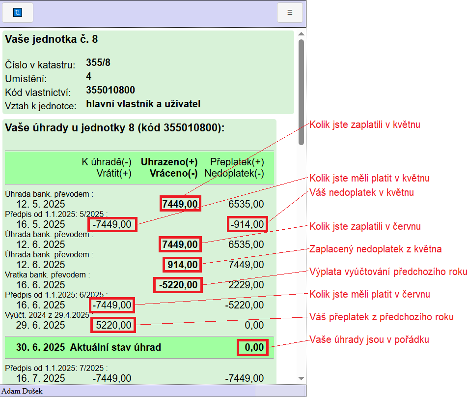 Zde vidí vlastník bytu stav svých úhrad - v tomto konkrétním příkladu k 30.6.2025 nic nedluží. Vidí zde ale také několik svých posledních předpisů a úhrad. Pro lepší orientaci jsme do obrázku doplnili popisky nejdůležitějších údajů. Jednoduše se ale dá říct, že v prvním sloupečku (K úhradě/vrátit) jsou předpisy plateb, které mají být uskutečněny. Ve druhém sloupečku (Uhrazeno/vráceno), jsou platby, které skutečně proběhly (tento sloupeček je pro uživatele nejpodstatnější, a proto jsou údaje zvýrazněny tučným písmem). Ve třetím sloupečku je stav konta uživatele po provedení úhrady nebo započtení předpisu úhrady.